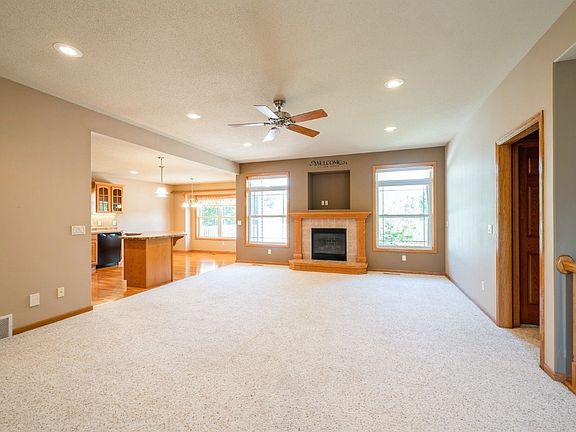 Welcome to this beautiful Wood Construction former Parade of Home. Step inside to an open floor plan with beautiful hardwood floors, and seamlessly connected living space. The kitchen features a breakfast bar perfect for quick meals and entertaining. The raised ceiling great room is centered around a cozy gas fireplace. The lower level expands your living area, featuring daylight windows that bring in plenty of light, making it an ideal gathering space, with recreation area for a pool table. Outside, the southern-facing driveway ensures quick snow melt in winter, while the northern-facing deck provides a cool, shaded retreat in the warmer months. Enjoy the peace and privacy of having no backyard neighbors, as the property backs up to the open green space of the subdivision's detention basin. This tranquil setting offers picturesque views and a sense of spaciousness rarely found in zero lot line property.