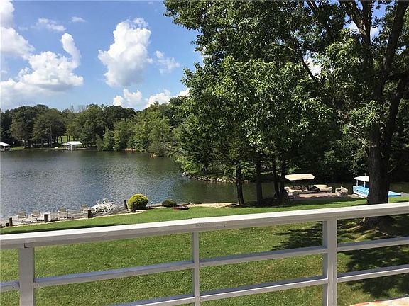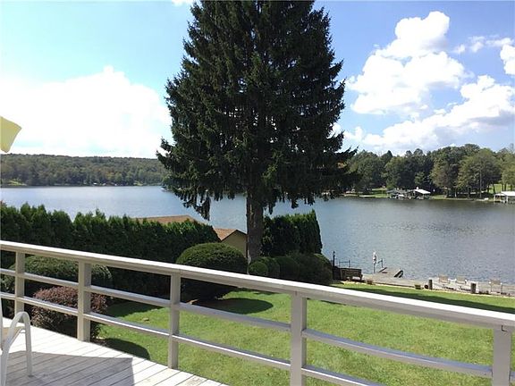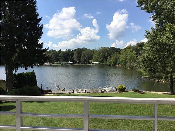 This superb waterfront vacation home features midcentury style on beautiful Indian Lake in the Laurel Highlands. The midcentury aesthetic is well displayed in this home's clean, angular lines and open floor plan with cathedral ceilings. Flooded with light, skylights, soaring floor-to-ceiling windows, and wall to wall full glass sliding doors each carry the interior flow out to the large deck and surrounding lake and evergreen landscape, which slopes gradually to the large lakefront dock. The structure's 3,000 square feet includes a foyer, lakefront living room, which opens to the kitchen, a lakefront den which opens to a kitchenette, four large bedrooms, all with lake views, four baths, and a large walk-out. Greige floor to ceiling brick, log storage niches, and two raised hearths grace two wood-burning fireplaces. 725 sq ft terraced, cantilevered dock, built-in benches, electricity and boat lift all grace the waterfront which gradually tapers from shallow to deeper water.
