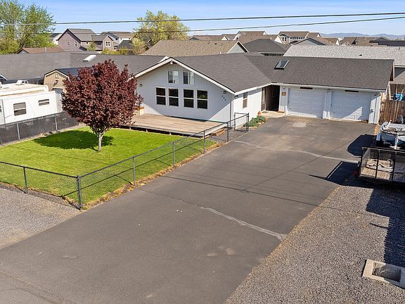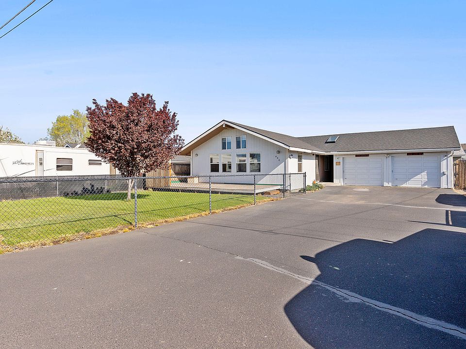 Beautifully updated 3-bed, 2-bath home blending comfort, style, and functionality. Striking curb appeal with modern exterior, large front deck, and charming details. Located in a peaceful neighborhood offering privacy and a sense of community. Bright open layout with vaulted ceilings and wall of windows. Remodeled kitchen with oak cabinets, updated counters, LED lighting, and modern appliances. New flooring, oak trim, and updated fixtures throughout. French doors with built-in blinds lead to front deck. Fully fenced backyard with raised garden beds. Oversized garage, natural gas heating, cooling, and water heater. Roof approx. 8 years old. Includes fridge, washer, and dryer with full-price offer. Move-in ready. You don't want to miss it!