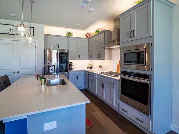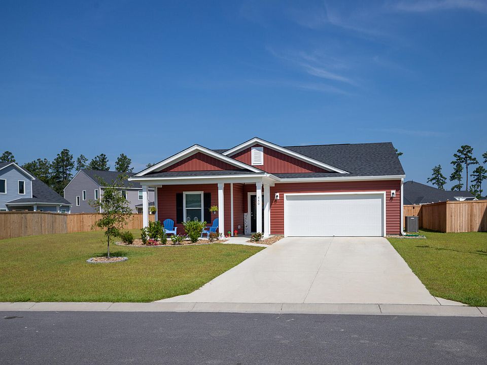 Practically brand new! This adorable ranch is not even a year old and still has the 2-10 warranty that will transfer! Built by Ashton Woods, named 2023 Builder of the Year by Builder Magazine! The covered front porch welcomes you into this 3 bedroom split floorplan. Two guest rooms and a full bathroom are at the front of the home. Follow the luxury vinyl plank flooring into the heart of the home. The gorgeous kitchen has quartz countertops, a gas range, stainless steel range hood, wall oven, upper and lower cabinet lighting, and a large island overlooking the living room. The dining area is adjacent to the rest of the main living space, allowing for an open concept space perfect for entertaining. The primary bedroom is tucked away with an ensuite bathroom and TWO walk-in closets. Outback is a fully fenced in yard and patio area. This home has a tankless water heater, gas heating/cooking, 2 car garage, tile floors and quartz counters in both bathrooms, and ceiling fans in all bedrooms. The Woodwinds has a community pool, playground, and walking/golf cart trails throughout Cane Bay. Owner is related to co-list agent.