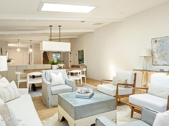 Coastal elegance meets modern luxury in this stunning beachside retreat, just one block from the shore. A striking shingle-style exterior, lush landscaping, and a charming covered entryway set the tone for effortless indoor-outdoor living. Step inside to soaring ceilings, shiplapped walls, skylights, and expansive windows that flood the home with natural light. The open-concept design seamlessly connects the fully renovated kitchen, dining, and living areas, featuring custom lighting and high-end appliances and finishes. A spiral staircase leads to a versatile flex space—perfect for an office, game room, bedroom or lounge. With multiple guest bedrooms and a thoughtfully designed first floor primary suite, this home balances style with comfort. Outside, a resort-inspired backyard offers an expansive lounging space, no maintenance turf, a sparkling pool, summer kitchen, heavy privacy foliage, exterior lighting, and an outdoor shower—ideal for rinsing off after a day at the beach. Thoughtfully designed with premium details throughout, this home is a rare blend of sophistication, relaxation, and the ultimate beachside lifestyle in the sweet spot of Atlantic Beach.