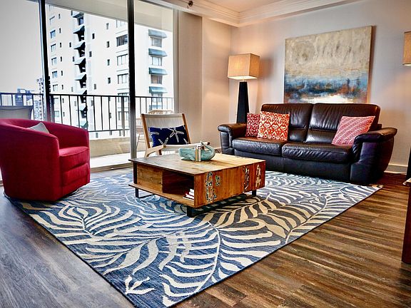 Luxe Royal Garden Corner Unit - Ocean Views, Designer Appointed! A spacious, luxurious 2 bedroom, 2 bath condo with tasteful interior accents and modern amenities, to combine modern luxury with classic Hawaiiana charm. Nestled on a quiet street off of the Waikiki boardwalk but an easy walk to the beach and all the area's attractions. Featuring a spacious master suite, a second bedroom with two double beds, and living area with foldout sofa bed. There is over 1,200 square feet of space. Enjoy three lanais, all with panoramic and ocean views. Monthly SPECIAL RATE now through in progress. Designer appointments including high-end Natuzzi sleeper sofa, classic art and interior design elements make for a luxurious and relaxing accommodation. This condo is set up with WiFi, streaming entertainment, a fully stocked chefs kitchen, and beach gear. This property is completely furnished, including linens and towels, beach gear and cookware. Pool is on the ground level. A Smart TV, DVD player and games are provided for entertainment. Both bedrooms have a writing desk and cable TV. The condo has an ensuite full-sized washer and dryer. The 4-Star Royal Garden hotel features on-site amenities which include a pool with barbecues poolside and a fitness room. A car is not needed from this versatile location, but if you have a vehicle there are a number of parking and transportation options available. Valet or nearby self-park public parking (monthly rate available-pls inquire). Also right nearby are The Waikiki Trolley, and The Bus and Biki bike rentals. Street parking is also available in the area. Please inquiry WITH YOUR DESIRED DATES for a prompt reply. Please feel free to inquire with your dates, and then apply online. Fully-furnished, including cookware, linens and towels. No pets, no smoking. All utilities and taxes included. Currently available for a month-to-month, or 3-month lease. Note that this is NOT a long-term rental. One month security deposit, Out-cleaning is $250.