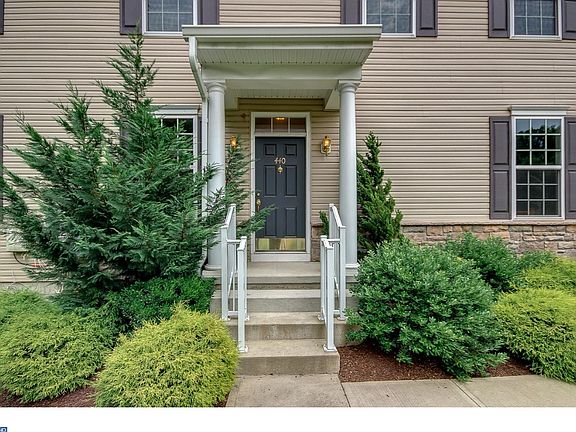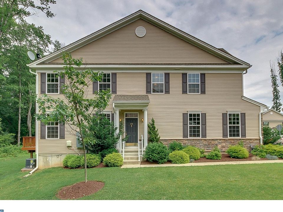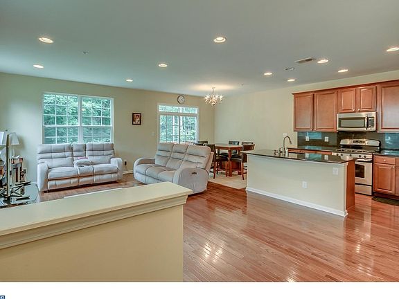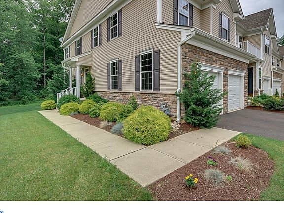 WELCOME to this stone front end unit townhouse that has it all - Premier location within steps from shopping, restaurants, etc., that backs to bucolic wooded grounds. Welcoming walkway features Landscaped private side entrance. You will immediately notice the open first floor plan with Glistening Hardwood floors from foyer and continuing throughout the first floor, also with soaring 9' ceilings.Great for entertaining, the Living room and dining area are open and flow well with a slider to the rear deck which faces a lush private wooded lot. Center island kitchen with granite counter tops, under mount stainless steel sink and an Upgraded appliance package along with Upgraded maple cabinetry make this kitchen a cooks dream.The impressive Open staircase leads to a large 2nd floor landing filled with light. Laundry room is conveniently located off 2nd floor hallway. Large Master Bedroom boasts 2 walk-in closets and has a well appointed Master bath with large Luxury double shower with ceramic tile walls and floors, Platform tub and double vanity. Two additional roomy bedrooms complete the 2nd floor.2 car attached garage and full basement for storage. This is absolutely one of the best locations in the community!