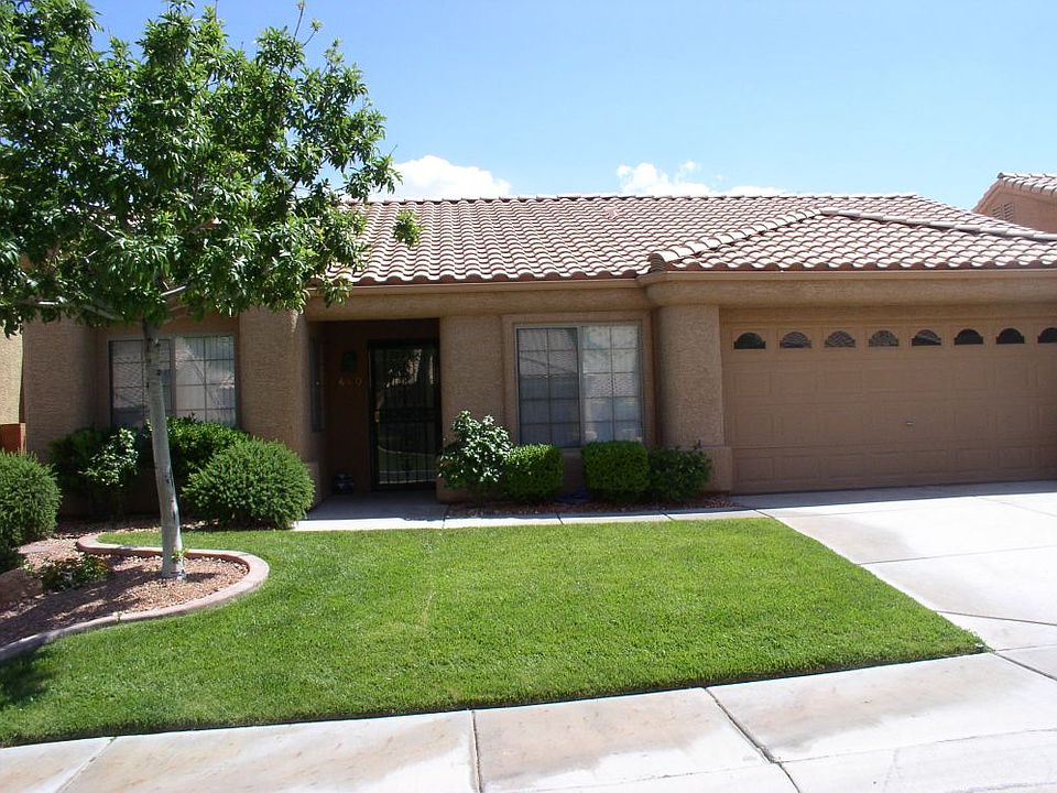 Beautiful, extremely well maintained home in a gated community. From the moment you walk through the front door you will see it is ready for you to move in to! This home is a 2 bedroom with office/den (Assessor listed it 3 bedrooms). Newer carpet, wood laminate flooring, tile and paint give the home a bright fresh look. Spacious living room with slider leading to covered patio. Lovely kitchen with all the appliances and a dining area. Very nice guest bedroom and guest bathroom has grab bars in the bath/shower. Spacious Master bedroom with 2 closets. Master bath has new tiled shower with grab bars. In the garage is an upright freezer, storage cabinets with locks and a workj bench. Backyard features a full length covered patio with beautiful landscaping and some mountain views. Gutterig has been done on the entire home. You will love this home!