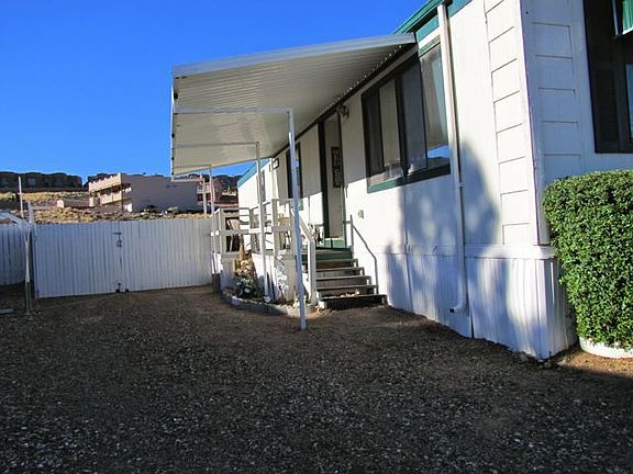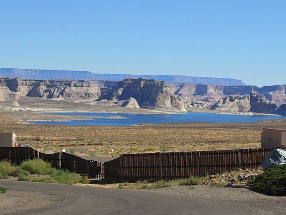 This 1979 Fleetwood has 1440SF has three bedrooms, two bathrooms and is in move in condition. There is an enclosed double deep carport on the west side and a beautiful porch facing Lake Powell on the east side. Extra parking in the back too. The home has a furnace and central air conditioning to keep you comfortable year around as well as new vinyl planking flooring through out. It comes with a stove, refrigerator, washer, and dryer. BASICALLY, IT IS READY FOR YOU TO OPEN THE DOOR AND MOVE IN. The previous owners had added a new central AC and Water Softener, Two new toilets in 2015 (one replaced in 2022), Ostmotis Water System in Kitchen, Front Awnings and shutters on the home, Wood Tool Shed and gate on side of the home. All windows replaced with double pane in 2021. 2022 renovation included vinyl planking flooring throughout entire home, baseboards, window trim, interior paint, revamped irrigation system, bathroom fans, window blinds