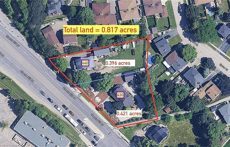 TOTAL - 0.817 ACRES LOT AVAILABLE FOR SALE. 430 Shantz Hill Road Cambridge (0.421 ACRES) (MLS - 40723531) to be sold together with 440 SHANTZ HILL ROAD CAMBRIDGE FEATURING 0.396 acres land with R3 Zoning available for sale with a detached home built on it featuring 6 spacious bedroom, 3 bathroom on a fully fenced and gated land. Additionally, it has a large detached garage/ workshop that is heated, insulated and equipped with hydro ,running water and a portable A/C unit. Just minutes from local amenities, Riverside Park, Schools, and quick access to highway 401. Many possibilities including residential or commercial development. Zoning amendment might be required.