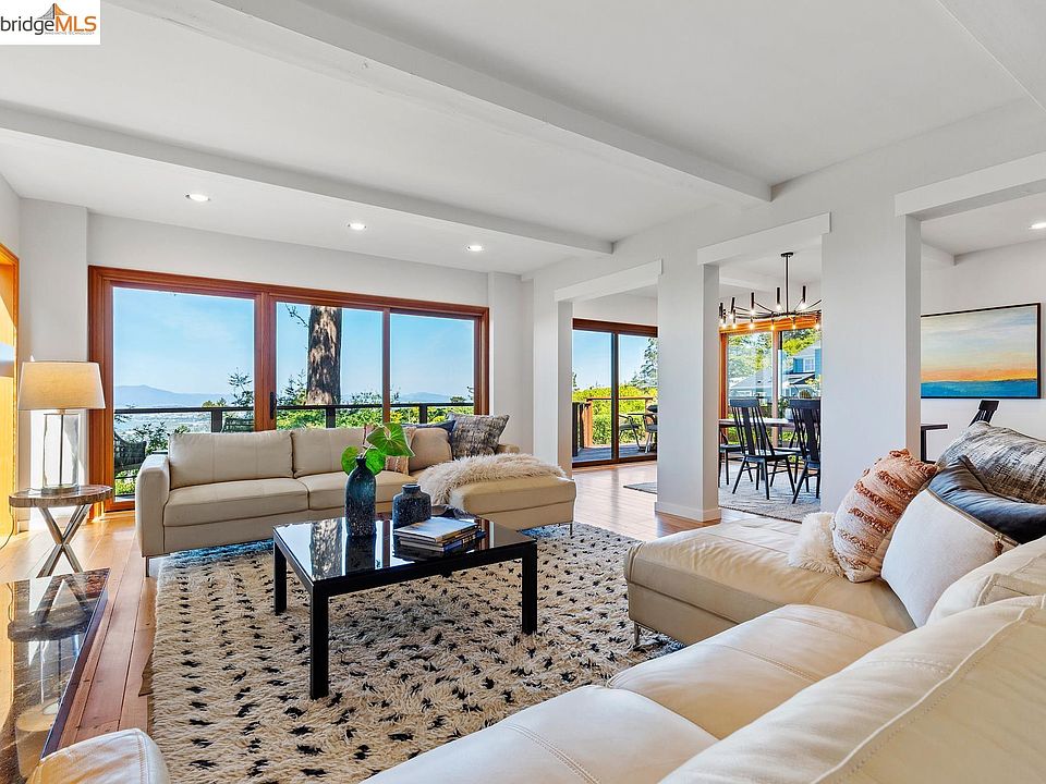 Spacious North Berkeley Hills view home ideal for extended family or those wanting flexible spaces! Level in entry from the serene courtyard garden, a sunny spot for outdoor dining. Step inside and be wowed by the wall of windows framing a truly awesome 3 bridge view! Open-concept rooms flow from the living and expansive dining areas through the gourmet kitchen to the perfect casual meals or work space with interior garage access. The main floor 4th bedroom or office with its ensuite powder room could easily serve as the desirable level in guest bedroom. Three generously sized bedrooms on the upper floor include the primary suite, an absolute dream with it’s sweeping bay view and expansive walk in closet. Enjoy a tastefully updated bathroom with elegant stonework, soaking tub, walk in shower and double vanity. Two additional bedrooms share a classic retro bathroom with double vanity and shower stall. The lower level offers a 5th bedroom, full bath, living area and kitchenette. There is a room for quiet retreat and a wine cellar. When the fog rolls in you can step outside to your hot tub and private sauna! Enjoy a manageable garden and a glorious sunroom plus the convenient location close to parks, trails, schools and Kensington shops.