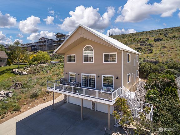 $10,000 seller paid closing costs with full price offer and 2024 HOA dues paid in full. Room for EVERYONE and AMAZING river, hills, and sunset views. Private and tranquil sanctuary at end of road with room for all the toys. Enjoy coffee on the patio which provides cool shade or sit on the deck and watch the spectacular sunsets with a glass of wine. On those cozy winter nights enjoy the propane fireplace. Attached 3 car garage, private office & laundry room. Second-floor spacious primary with en suite, 2 additional bedrooms. Upper floor offers more sleeping accommodations & full bath. First floor has 1/2 bath and 2 additional sleeping rooms. Super fun space in the loft. Newer paint, heat pump and deck railings.