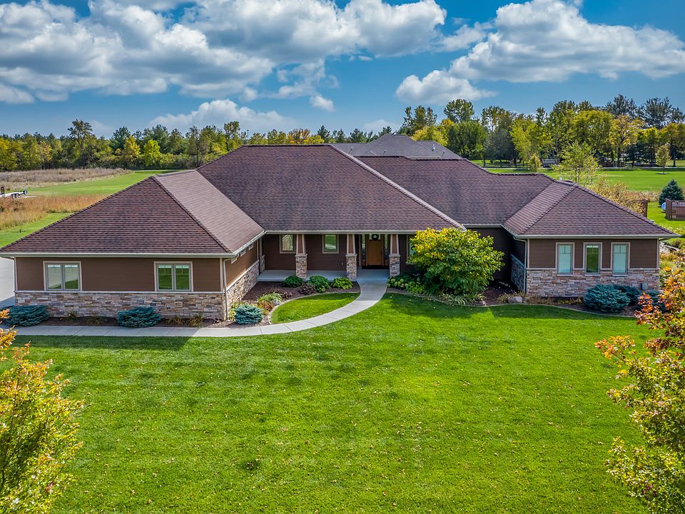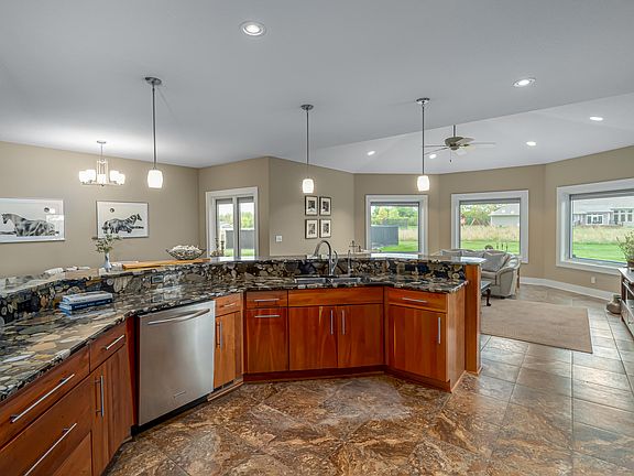 Beautiful 4-bedroom executive home with large sun filled windows, warm cherry woodwork, and an amazing 3.77 acres filled with tall grass prairie and wildflowers. This Pinnacle built home features attention to detail and quality throughout. The kitchen is truly the heart of the home with gas cooktop, spacious center island, beautiful granite countertops, and an inviting sunroom. Just off the kitchen you will find the main floor laundry and family room with 11 foot ceiling and stone fireplace. Relax in the master bedroom suite with its spa-like tiled shower and whirlpool tub. A second main floor bedroom offers the perfect place for a home office. The finished lower level will be your main place to hang with family and friends. It features a large wet bar, two additional bedrooms with their own private baths, and walkout access to the patio. You will love spending time outdoors at this home. Whether you are grilling on the patio, relaxing by the water fall and watching koi in the pond, tending the garden with its raised beds, or tinkering in the 3+ car garage with in-floor radiant heat. This zero entry home was designed for accessibility with wide doorways, halls and stairwell. It also has a generator backup and hidden storm shelter. Energy efficient with LED lighting, geothermal heating, and a rain water collection system for irrigation. Call today to see your new dream home!!