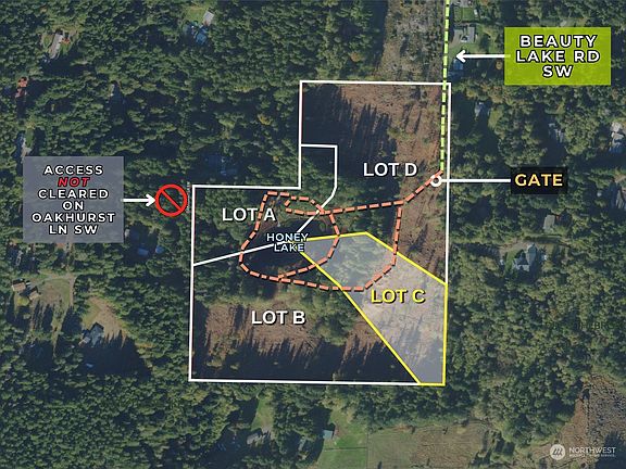 Buildable lot w/ frontage on a private lake known as Honey Lake. This 4.95 acre parcel offers western water views, great fishing, gated entry, & multiple sites ready for your new home. Nicely treed along the shores along w/ roads & nature trails in place. Mostly level topography with some rolling & gradually slopping areas. Soils should allow for an easy septic install & an average well depth in the range of 100-125 ft. Electric located on Beauty Lake Rd SW. Replanted with Douglas Fir. Very private location yet close to food, shopping, & commuter options like Sedgwick, Sidney, Old Clifton, & Hwy 16. Owner financing offered along with additional abutting land for sale: 2 parcels that are each just shy of 10 acres.