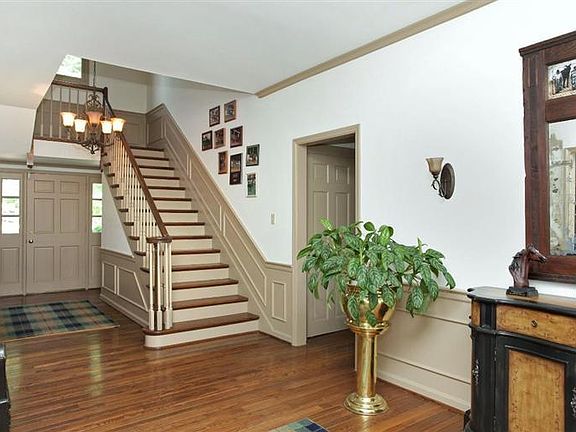 An outstanding horse facility in a beautiful setting and an even better location. The Morton built 21 stall barn is connected to the 180' x 60' arena. Everything about this barn is world class- tongue-in-groove lacquered woodwork, heated barn, open airy stalls with windows, wash stall, elaborate offices, tack rooms, and viewing rooms. The entry to the farm is via a classic stone entrance down a winding paved road that is extra wide for a trailer. An outdoor track is prominent at the road. This farm has been used for multiple videos and photography shoots for the USEF. There is a second 12 stall barn for mares. The main house has a stunning setting atop a knoll overlooking the farm. The house sports a circular drive surrounded by a stone fence, designer landscaping, hardwood floors throughout, extra wide halls, 9' ceilings, sunroom and a first floor owners suite and office.