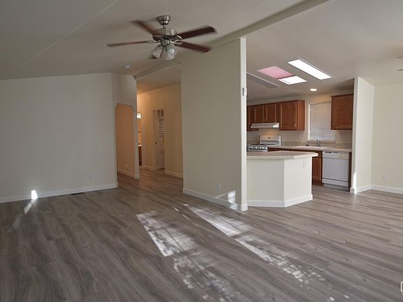 Located in the heart of the Royal Palms community, this two bedroom plus office, two bathroom doublewide has brand new flooring throughout, and ready to move-in. Kitchen has lots of storage and spacious for entertaining or holidays and stove, dishwasher and SS refrigerator included, indoor laundry room with upper and lower cabinetry and storage closet with washer and dryer to be included, exterior has fruit trees and enclosed privacy fence. The community park has private putting green and 3-hole golf course, dog park area, club houses with kitchen and pool/spa all exclusively for residents only. Make an appt and come take a look. Super cute property.