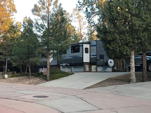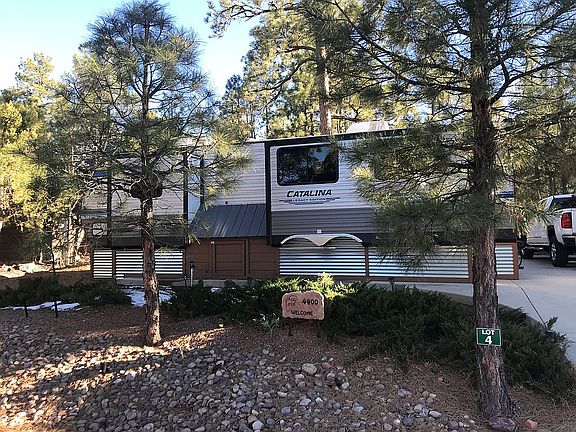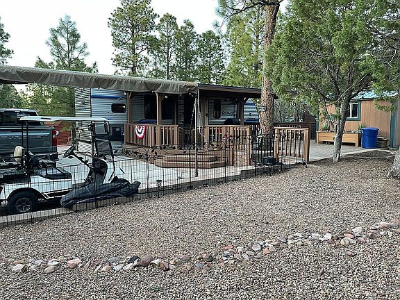 Nestled within the serene White Mountain Vacation Village, this owner owned premium property with bonus 20’ x 60’ (1200 sq ft.) backyard area with forest beyond offers a unique blend of comfort and luxury for your family , friends and pets. This property includes the 2020 Coachman Catalina 303-RKDS Legacy Edition which provides a spacious and elegant living space, complemented by a large covered Trex deck that blends into the raised brick patio and expansive fenced backyard. With additional amenities such as an 8’ x 10’ Tuff Shed and extensive storage options under the skirted trailer. This property is not only a haven for nature enthusiasts but also ensures practicality and convenience. The dual-vehicle concrete parking adds to the ease of living, making it an ideal retreat for those seeking a harmonious blend of outdoor beauty and home comforts. The 33' Coachman presents a delightful blend of comfort and rustic charm, offering a serene retreat with its expansive windows that frame the tranquil backyard and the lush forest beyond. The dual AC units ensure a cool and pleasant atmosphere. As the evening chill sets in, the warmth of the two electric fireplaces in the living room and bedroom creates a cozy ambiance, complemented by the reliable floor-vented propane heating for a consistent and toasty environment. The convenience of the stacked washer and dryer, tucked away in a dedicated closet, adds to the thoughtful design of this inviting space, making it a perfect haven for relaxation and enjoyment of nature's beauty. HOA includes water, sewer, trash and road maintenance. Internet/cable available with provided Starlink.