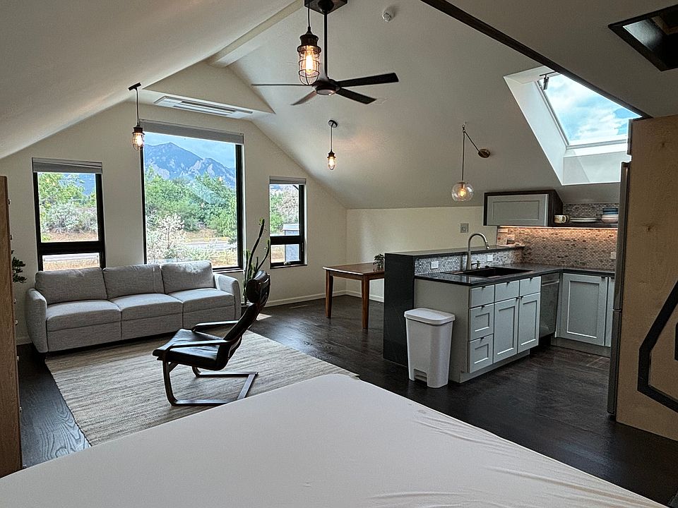 UTILITIES INCLUDED. Located in a newly built detached building, this studio apartment feels like a stand-alone home, with private walkway from street and grassy lawn space. Tall windows with Flatiron views and large operable skylights (with shades) fill the 2nd floor studio space with light and air. A sleeping loft/meditation space overlooks the living area and provides a cozy nest with a view over the neighborhood rooflines. Apartment doesn't have separate enclosed bedroom. The convenient location is a 5 minute walk to Table Mesa station; 1/4 mile to Safeway and Colorado Athletic Club; on bike path that leads directly to CU and Boulder's network of biking and hiking trails; 8 minute drive to downtown Boulder and 25 minute drive to downtown Denver. Amenities included: central air, central heat, dishwasher, hardwood floors, stainless steel appliance, updated kitchen, updated bathroom, 40 sf of storage, EV charger, washer dryer and yard. utilities included: electricity, heat, internet, air conditioning, trash pickup and water. PV panels and energy efficient HVAC make this one of the greenest options in town. Advanced fire sprinkler is installed. Date Available: October 1st 2024. $2,250/month rent for a 1-year lease. [Open to flexible terms and length of lease] 1st and last month's rent required. $2,250 security deposit required. Cat's are ok with additional $250 pet deposit. No dogs and no other pets allowed. Please contact owner to learn more. Can offer unit as fully furnished, available on October 15th (open to quarterly vs 1-year) for $3,250/mo. Rental Lic #RHL-00999457