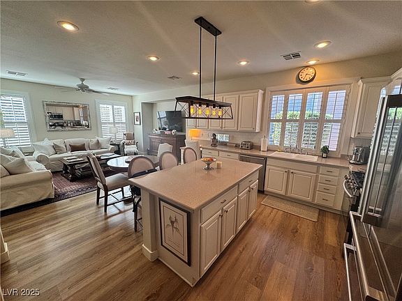 Beautifully updated single-story home in the guard-gated, age-restricted golf course community of Siena. This bright, open floor plan features luxury vinyl flooring throughout the living areas, fresh paint inside and out, new recessed can lighting in the kitchen and family room, plantation shutters, and new toilets. The kitchen and living spaces flow seamlessly, creating a warm and inviting atmosphere. Step outside to a tranquil, fully fenced backyard with covered patio, pavers, artificial turf, and low-maintenance landscaping—perfect for relaxing or entertaining. Conveniently located near the Siena Clubhouse with access to world-class amenities including golf, fitness, and social activities. A true turnkey gem in one of Las Vegas’ most desirable 55+ communities.
