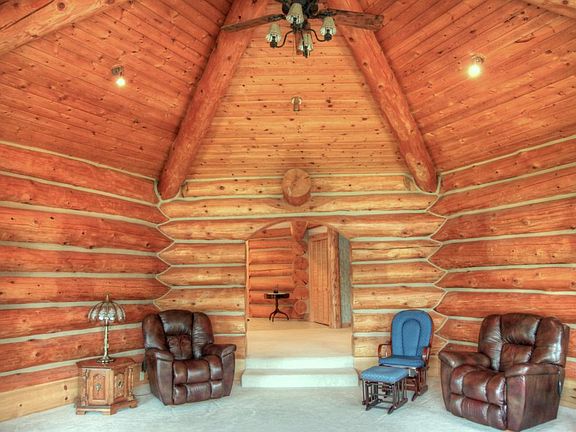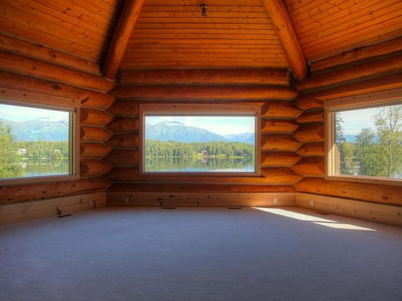 Anderson Lake!! This Log Home has been crafted with 18 inch natural logs! Featuring over 5700 sq ft, this 4 Bed, 3 Bath home has plenty of room for everything! Features include a beautiful hexagonal Living Room with a Cathedral Ceiling and Sweeping Views, an Office/Den, Master w/ private bath, tons of Storage, Custom Closets & Cabinetry, a lovely Kitchen with beautiful Appliances & Fixtures. Recessed Lighting, Vaulted Ceilings with most Rooms having awesome views of the Gorgeous Lake and Mountains! Outside is a huge wrap-around Deck, a large Yard running down to Anderson Lake, decorative block terracing, Stonework foundation, a large Parking area with R.V. Parking and a Custom 812 square foot log Garage! You will want to call this Home yours!!