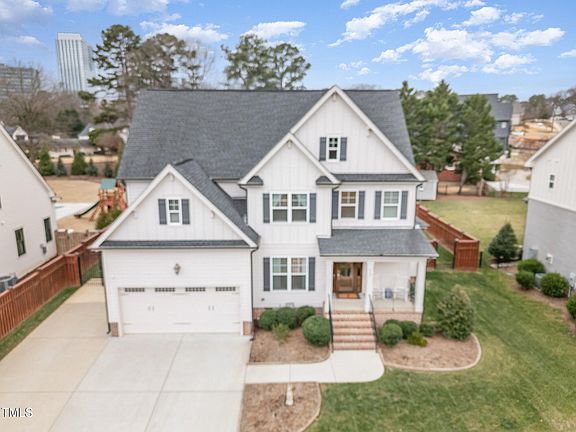 Tucked away in the sought-after Farrior Hills neighborhood, 4401 Lambeth Drive offers the perfect blend of modern luxury and everyday convenience. This 5-bedroom, 4-bath-bathroom home, built in 2016, spans 3,144 square feet of beautifully designed space with thoughtful upgrades throughout. From the moment you step inside, you'll be welcomed by high ceilings, rich hardwood floors, and an abundance of natural light. The open floor plan creates a seamless flow between the living, dining, and kitchen areas, making it ideal for both relaxing nights in and lively gatherings. The gourmet kitchen is a chef's dream, featuring a gas range and convection oven, all designed to make cooking and entertaining effortless. The primary suite is a true retreat, offering a private sitting area and two expansive walk-in closets. Additional bedrooms provide plenty of flexibility for guests, a home office, or bonus space. The living room fireplace with a built-in blower adds warmth and charm, while high-definition wood blinds throughout the home add a touch of style and privacy. Step outside and experience a backyard oasis designed for ultimate relaxation and entertainment. The heated saltwater pool, hot tub, and cascading waterfalls create a private resort-like atmosphere while overlooking an amazing skyline view of North Hills. A covered porch and patio provide the perfect setting for outdoor dining, while a pool bathhouse and upscale privacy fence enhance the overall experience. A large shed/workshop offers extra storage or workspace, and an oversized driveway with additional parking ensures convenience for both homeowners and guests. Located just a short walk to North Hills, this home provides easy access to some of Raleigh's best shopping, dining, and entertainment while maintaining a peaceful residential feel. With luxurious features, an unbeatable location surrounded by new homes ranging in the $3M+ range, and an inviting layout, 4401 Lambeth Drive is the perfect place to call home. Don't miss this incredible opportunity!