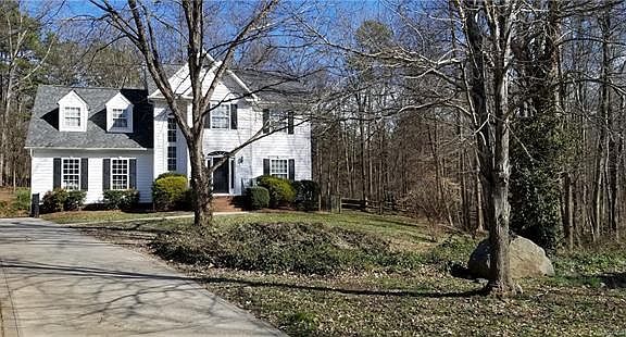 Beautiful two-story home nestled on large wooded lot at the end of cul-de-sac. Property features welcoming two-story entryway, formal living room & dining room, open kitchen w/ granite counters, stainless steel appliances, center island, pantry, white cabinets & breakfast nook, large family room w/ real wood burning fireplace, laundry room, 1/2 bath. Surround sound in family room. Built-in speakers in formal living room, master bedroom & wiring for outdoor speakers. Laminate flooring throughout main level. New carpet on the stairs & throughout upper level. Large MBR Suite includes vaulted ceiling, private bathroom w/ garden tub, stand-up shower, dual sinks & walk-in closet, two secondary bedrooms, & large 4th bedroom/bonus room, secondary full bathroom. Rear entry garage w/ new insulated garage door. New hot water heater 12/18. Private fenced yard has a wood deck for patio furniture & spacious white shed perfect for storage. Two additional parcels included. Total lot size is .94 ac.
