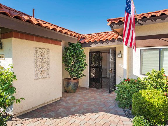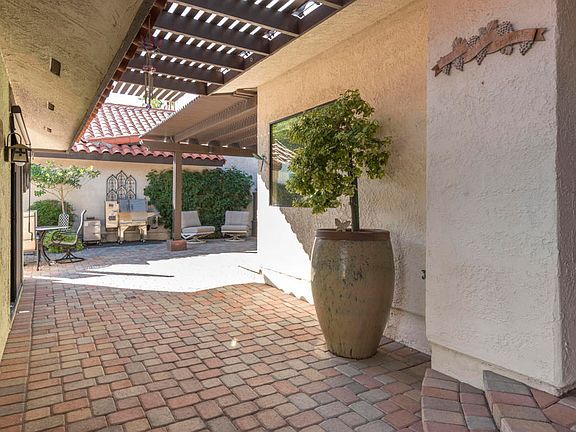 This classic Mediterranean-style Indian Wells home sits in the gated community of Los Lagos, which was designed by renowned Architect Barry Berkus. While the central location may have some buffered traffic noise, the end of cul-de-sac location and large opposite side yard patio, offers excellent privacy. This ''Villa'' is a true and traditional Desert Retreat, with an excellent indoor/outdoor flow, numerous niches perfect for relaxing and entertaining, light filled rooms w/ wood beamed ceilings, wood laminate flooring (in dining/living areas) and focal point lodge style fireplace in Living Room. Spacious Chef's kitchen with newer premium appliances, granite countertops with views overlooking the charming back courtyard. The Primary Suite features walk-in closet and spa-like bath with adjoining atrium. Off the laundry room is a home office & hobby/craft area with direct access to the Courtyard (formerly a golf cart garage). Directly across is a separate Casita with bath, formerly used as a home gym/office. The home is surrounded with lush mature landscaping, and includes herb & rose gardens on the north side. Enjoy entertaining in the outdoor kitchen complete with built-in grill. This home has been METICULOUSLY maintained; with upgrades such as a premium epoxied garage floor & extensive interlocking brick driveway & courtyard with Alumawood covered courtyard patio area. Los Lagos offers tennis/pickleball, pools/spas and beautifully maintained common areas and lush landscapin