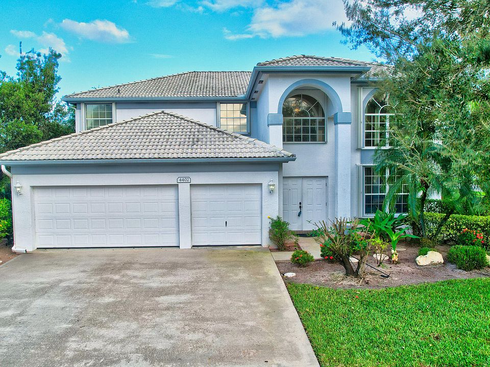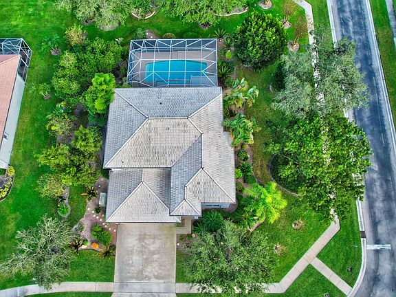 Big & BEAUTIFUL 4-5 BR, 2.5 BA, 3 car gar. POOL home on nearly 1/2 acre, lushly landscaped corner lot in gated community. 3820 sq. ft., in a roomy layout, w/ primary suite & additional powder room on 1st floor. Big family room, plus a huge loft on 2nd floor, easily converted to 5th BR. & still have a loft area. Big 23 x 12 kitchen updated w/ loads of storage in white cabinets & granite counters. Luxurious primary suite on 1st floor, includes his & hers walk in closets, double vanities, a soaking tub, separate shower. There are accordion shutters for all openings, a whole house generator, & dual zone A/C. Lovely pool has waterfall feature & plenty private. Work bench, pull down ladder, & extra fridge in 3 car garage. The gated community is gated & well located for highway & beach access!