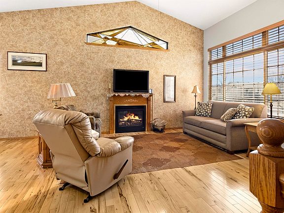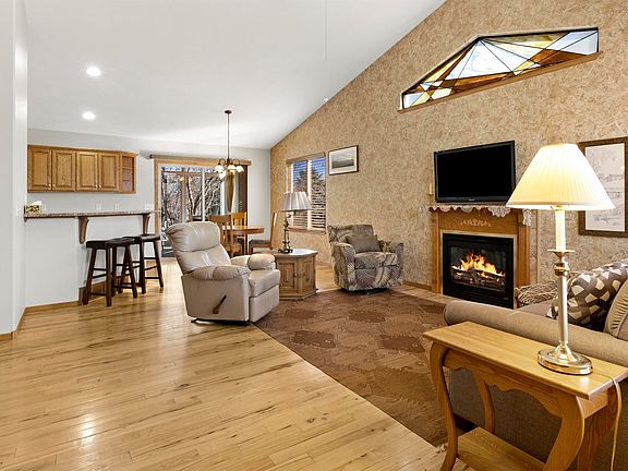 This ranch-style walkout twin home is a true gem. Featuring a vaulted, open-concept design, the home boasts elegant decorative colors and hickory floors throughout most of the main level. The kitchen shines with sleek granite countertops, complemented by stylish light fixtures and wood blinds. The bathrooms feature ceramic flooring for a clean look. Convenience abounds with main-level laundry and two cozy fireplaces. The lower-level walkout leads to a private patio, perfect for relaxing and is east facing to extend that shaded comfortable setting. Adding to the charm is a beautiful three-season room with direct access to the also east facing shaded deck. The insulated, finished double garage offers additional comfort and functionality. To top it all off, the landscaped yard is second to none. Simply move in and enjoy!