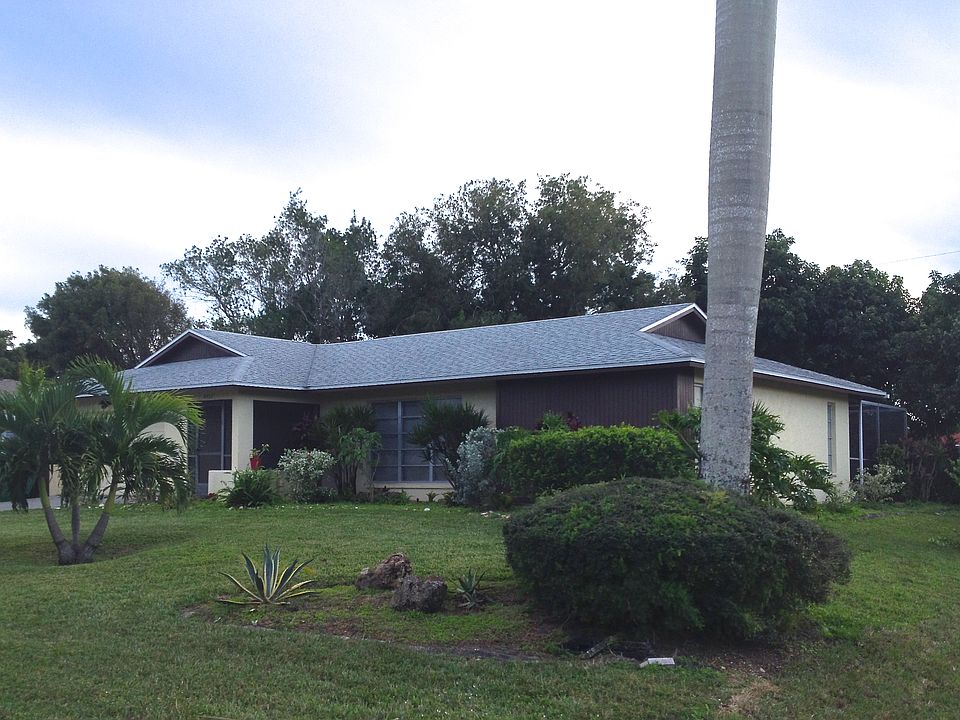 Tons of potential in this oversized 2 bedroom/2 bath with den and 2 car garage across from gulf access homes. Split bedrooms are oversized with walk in closets. Nice sized den with vaulted ceilings accented with beams. Living/dining room combination. Beautiful corner lot in quiet southeast neighborhood. Screened entry allows for tropical breezes to flow through. Screened-in lanai overlooking south exposure tropical oasis with plenty of room for a pool. Home does need updating, but has been well maintained. New roof in 2005, re plumbed in 2004, electrical updated in 2010. ASSESSMENTS IN AND PAID