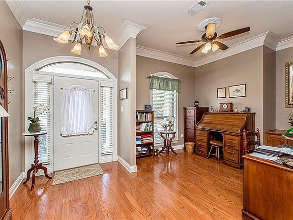 Such a lovely well maintained home with custom double & triple crown molding in the living areas, 9' & 10' ceilings with lovely tray ceiling detailed with crown molding in the primary bedroom, which includes double walk-in closets and bath with double vanities and jacuzzi tub. Natural gas fuels the whole-house Generac generator, heat, fireplace & hot-water heater. Garage opens up on patio side and will accommodate two compact cars easily & includes a convenient storage room. Primary bedroom, living room and kitchen allows entrance to the very inviting covered back patio and flower covered arbor and separate raised wood deck. There is underground drainage, a 4-ton HVAC which includes new coils in 2021 and a new compressor in 2011. Home is under termite contract with J & J Exterminating. Kitchen has island and ceramic countertops. Refrigerator, washer/dryer, & curtain/valences do NOT go with the sale; but the large framed mirror in the dining room DOES go with the sale. Nine (9) new insulated windows installed in last two (2) years by Window World. A one-year Old Republic Home warranty will be given to the buyer at closing. Brick with stucco front construction.