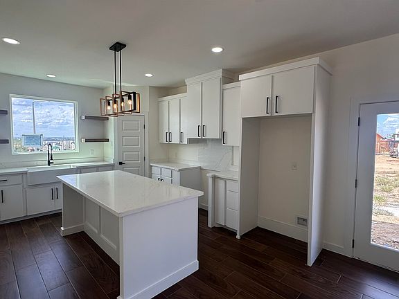 Quartz countertopsOver sized islandDouble door entrywayFarm sink