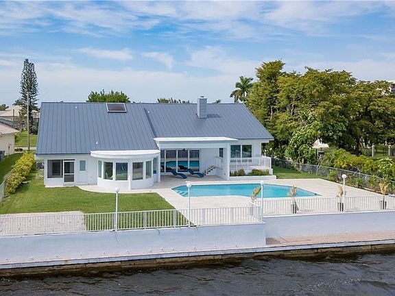 Southern exposure meets resort style living, in this custom built riverfront pool home on an OVERSIZE lot with VIEWS, VIEWS, VIEWS! Entertainer's delight w/ 95' of river frontage & concrete dock. Completely renovated in 2020 with the finest upgrades & features inspired by the owner. Everything is BRAND NEW from the Metal Roof to over 32 PGT Hurricane impact windows and sliders. It's a vacation every day at this remarkable estate with expansive, tranquil views across one of the widest spans of the Caloosahatchee River, and minutes to the Gulf. This luxurious estate is 3,267 sqft under air w/ high 15+ ft vaulted ceilings, 4 beds, 4.5 baths (1 is pool bath), Den, w/ a deep 2 car garage. It's a perfect setting for family gatherings, entertaining, and also checks all the boxes for a profitable seasonal vacation property due to its location & circular driveway for 8+ cars. The designer kitchen of your dreams offers exotic granite counters, custom wood cabinetry & luxurious stainless steel appliances. The master bath includes custom marble shower w/ multiple heads. If you have been waiting for that PERFECT Cape Coral home to live your dream, STOP - YOU HAVE JUST FOUND IT!