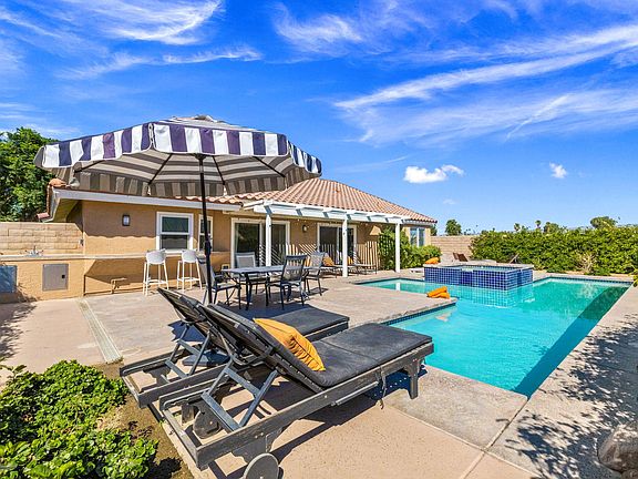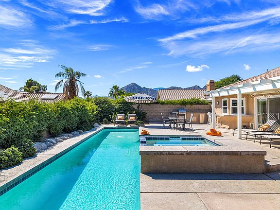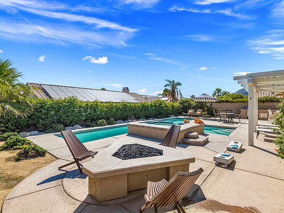 Welcome to 44030 Pinto Creek Circle, a beautifully upgraded 3-bedroom, 2-bathroom home situated at the end of a tranquil cul de sac, offering a unique sense of privacy with no neighbors on one side. The community of Indian Wells is known for its prestige, and this home offers a unique advantage - the ability for short-term rentals with a 2 night minimum, a rare find in this city. With low HOA fees, residents and guests can enjoy the amenities and convenience this community provides. Step into luxury as you are greeted by stunning porcelain plank tile floors that extend gracefully throughout the residence. The open floor plan and recessed lighting create a spacious and inviting ambiance, ideal for both relaxation and entertaining. In addition to the aesthetic upgrades, this home features a brand new HVAC system, stainless steel kitchen appliances, stacked stone fireplace. Take in the multiple mountain range views from the highly elevated entertainment backyard that includes a spacious pool with a new pool pump, spa, fire pit, outdoor kitchen with built in BBQ, refrigerator and sink. Plenty of space to lounge and relax. For those seeking a turnkey experience, the furniture is available for purchase outside of escrow, allowing you to seamlessly transition into your new abode. Don't miss the opportunity to call this exceptional Indian Wells property your home.