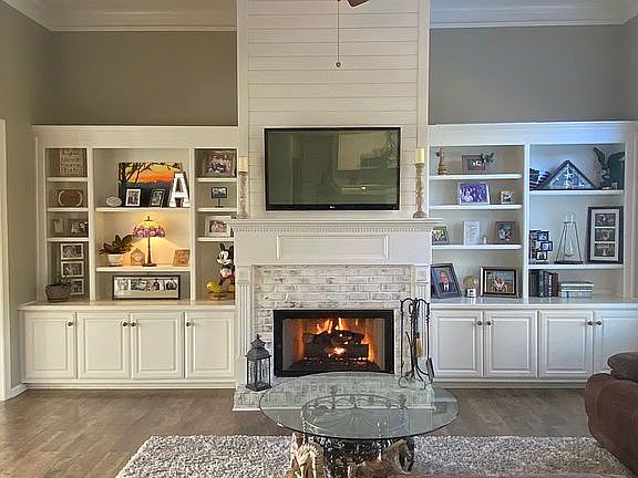 - Interior: Foyer - Entrance, Ceilings - Vaulted, Double Vanity, Gas Logs, Separate Shower, Walk-in Closet, Whirlpool Bath, Bookcases, Garden Tub, Ceilings - Trey, Hardwood Floors, Carpet, Tile Floors