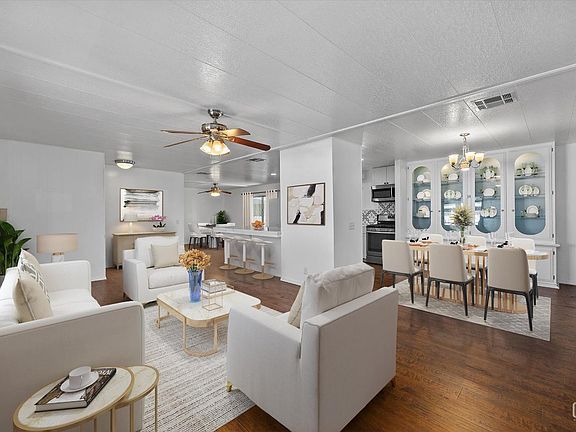 Spacious home located in desirable Royal Palm Estates a 55 and older park- This home is 1464 sq ft, shows bright and airy with lots of light and is situated on a large corner lot adding extra privacy. Bedrooms are large and both have walk in closets. One bedroom has brand new carpet. Features include hard surface plank floors, stainless fridge which will stay with the home, large laundry room, and attached service porch. In addition to the large bedrooms, the kitchen has an eat in bar area, large living area, breakfast area and additional room off the kitchen which could be used for formal dining or additional family den area. There is a ramp for access for those with disabilities. Home also features a large carport on the south side, & gated front yard area with patio. Community amenities include clubhouses, swimming pool/spa, pool table, ping-pong table, dog park, 3 hole golf course, BBQ & outdoor eating areas. There is also RV storage on site if you like to travel. A must see!