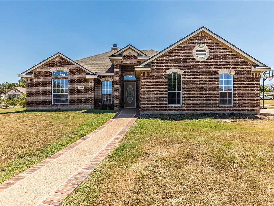 Presenting a fantastic new listing in the desirable China Spring community, close to shopping, dining, and top-rated schools. This charming red brick home is ideally situated on a corner lot in a peaceful cul-de-sac, offering expansive front and side yards with plenty of space for outdoor activities. The home's exterior is a standout, with a side-attached garage and driveway that allow the front to shine, highlighted by large windows and elegant white stone accents. Step inside to a welcoming open-concept living room, dining area, and kitchen—a layout perfect for both everyday living and entertaining. The living room features a stunning white stone fireplace that brings a touch of nature indoors, serving as a cozy focal point for the space. The mantel is ideal for displaying your favorite treasures or hanging holiday stockings. The adjacent dining area is bathed in natural light, thanks to large windows that brighten the entire space. The kitchen is designed with style and functionality in mind, featuring granite countertops, a stylish tile backsplash, and stainless steel appliances, creating a perfect setting for culinary creations. Down the hallway off the foyer, you'll find three generously-sized bedrooms, each providing comfort and ample closet space, along with a shared hallway bathroom. Tucked away at the back of the home is the spacious master suite—a true retreat for the homeowner. The en suite bathroom boasts dual sinks, a soaking tub, a separate shower, and his-and-hers walk-in closets, offering a luxurious and private space to unwind. The backyard is perfect for outdoor entertaining, with a covered patio that provides shade and a great spot for relaxation. This home is a gem in China Spring—don’t miss the opportunity to make it yours!
