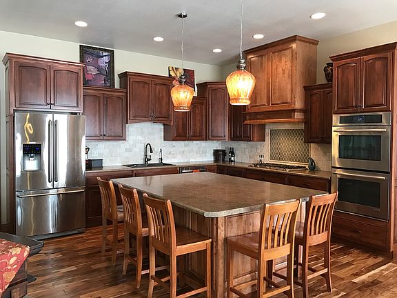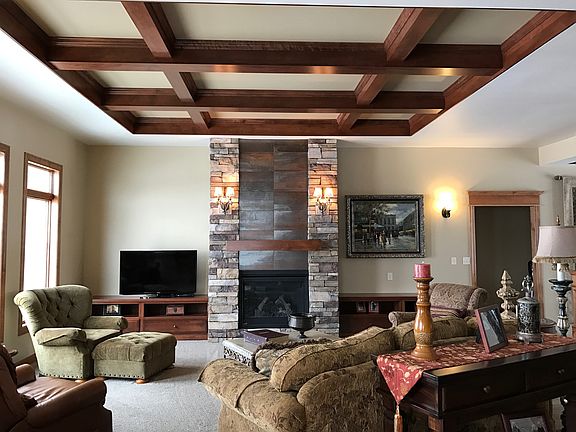 Stunning 5 bedroom + bonus/workout room, 3 1/2 bath open concept ranch home custom built by the Carpenter Company in summer 2016. Beautiful coffered ceiling with unique Bullseye wood beams. High-end birch Bullseye Cabinets throughout with soft close. Two cultured-stone floor to ceiling fire places. Dream kitchen with SS Jenn Air dual ovens and dishwasher and Dacor 5 burner gas cooktop, and Eletrolux French door fridge. 5 x 7 island with storage. Acacia wood floors and skip trowel texture on main. Full wet bar in basement with seating for 4. Upgraded Anderson Windows Series 400 throughout. Solid maple doors and 4” maple trim. 96% High efficient air source heat pump for heating/cooling, 105 gal. Marathon water heater, and in-floor electric boiler heat in basement - all on dual meter energy rate. Covered 12'x 16' deck. 1,915 SF on Main, Total finished 3,677 SF. 4 car garage (3rd stall is 16 x 42 feet deep) and 12.75 rated garage doors and fully insulated. Gas furnace, Hot/cold water, ceiling fans, drain. Custer EFIS and cultured stone on front of house.