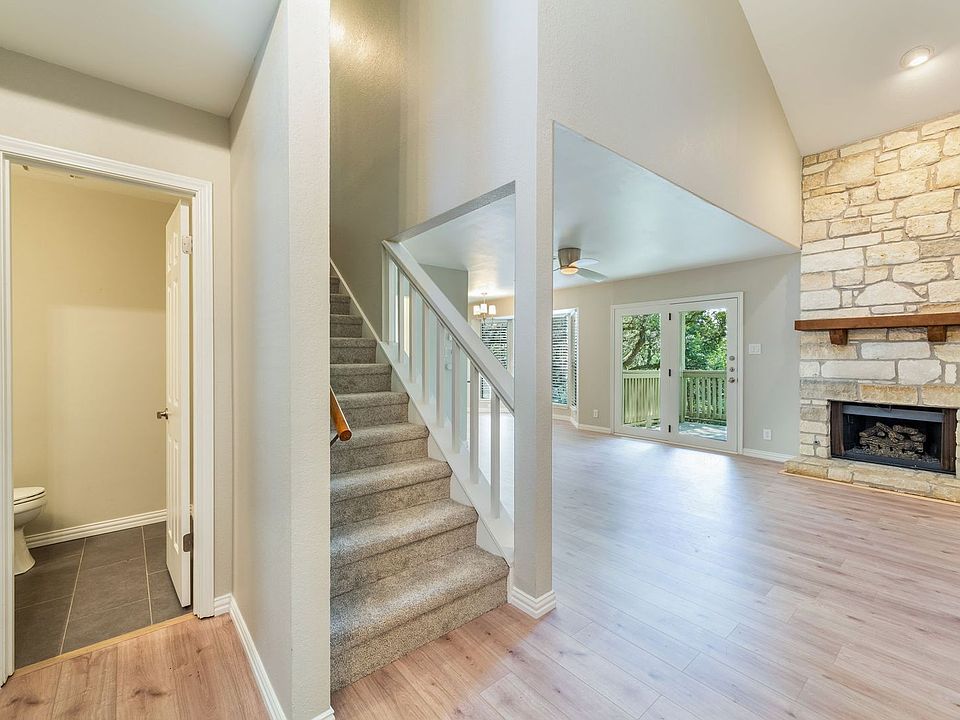Beautiful updated condominium in desirable Travis Country features 2 bedrooms, 2 1/2 baths and a one car garage. Kitchen has granite countertops and stainless steel appliances. Primary bedroom includes a second balcony facing a greenbelt and a beautifully updated en suite bathroom including a frameless glass walk-in shower. Travis Country Condos are located along Blue Valley Park with amenities such as a duck pond, basketball and tennis courts, swimming pools and an amazing park. All properties within Neighborhood Realty and Property Management's portfolio are required to participate in a mandatory Resident Benefit Package. This suite of amenities is designed to improve the quality of the tenant's experience while living in the property and maintain lease compliance. The cost of this program is $43 per month