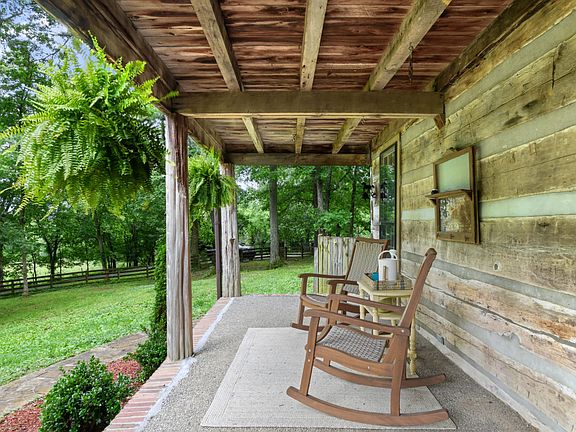 Your chance to own a piece of history! Built by famed builder Braxton Dixon, the mastermind behind the homes of Johnny Cash and other country music greats and featured in Garden and Gun, this serene log home sits nestled in the trees on 5.5 acres. Priceless architectural details from all over the world include: logs from two 19th Century log homes, antique doors, stained glass windows, light fixtures from Germany and Italy, mantel from the home of the first Governor of TN, reclaimed brick floors, and more! Fully fenced front and backyard with additional fenced level pasture behind house. TV bracket in Living Room does not convey.