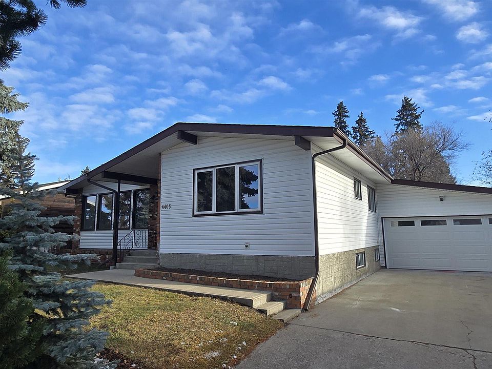 Beautifully 1,475 sq. ft. home with attached 432 sq. ft. garage on a large 8,450 sq. ft. fenced lot in a prime south side location in Vegreville. FRESH upgrades include paint, vinyl flooring, refinished kitchen, stainless appliances, updated plumbing/electrical fixtures, and more! The spacious front entry with dual closets opens to a large living room, flowing into a kitchen with ample cabinetry and a dining area that leads to a cozy family room with natural gas fireplace. Main level features a primary bedroom with 3-piece ensuite, two additional bedrooms, and a 4-piece bath. The finished basement offers a rec room with wet bar, bedroom, 3-piece bath, laundry, and two storage rooms. Enjoy the mature trees, garden space, air conditioning and RV parking in the expansive backyard. A perfect family home in one of Vegreville’s best neighborhoods!