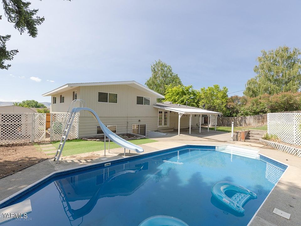 The pool is open and ready for summertime fun! Enjoy the slide, diving board and new pool pump, professionally opened and ready for hours of play. This home features 4 bedrooms, 3 bathrooms and two large living areas. In the main living room, enjoy a cozy fire on cold winter nights with the wood burning fireplace insert. The ample-sized dining room connects to the kitchen, where a double oven and new cooktop will make entertaining guests a breeze. Open the french doors to the patio, pool and terraced backyard. The lower family room gives many options from hang out space to home office or gym. It also has a slider that leads right to the pool. There are many updates over the last year, including: new carpet, paint, cooktop, built-in microwave and deck railing. All four bedrooms are situated on the upper level, some have hardwood floors, some have new carpet. The primary bedroom looks out over the cul-de-sac with a large slider to the private deck. The attached 2 car garage offers more parking or storage options. All these amenities and the convenient, central location make this home a Yakima gem!