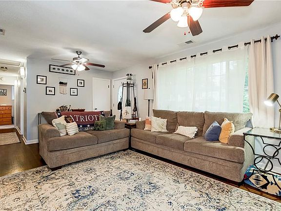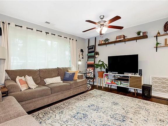 When you enter this lovely ranch with partial-brick exterior, you will immediately find yourself in the heart of your home: you enter directly into the living room, with open access to the dining room and kitchen. Behind the kitchen, drop down into a reading space, or potential den, perfect to cozy into after a long day. This space is also a perfect play area for children while parents are preparing meals. With direct access to the backyard, your family can be in and out throughout the day. Adjacent to this is a guest bedroom and full bathroom. The laundry room includes shelves and cabinets for convenient and multipurpose storage. An additional bedroom includes separate backyard entry. There are three bedrooms and bathrooms in total. In the backyard, this fully fenced corner lot includes storage shed, mature trees, concrete patio, and swing set.