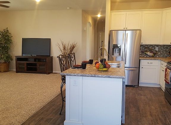 Located in 55+ community, this is a beautiful brand new 2 bedroom, ofc/den, 2 bathroom home with an open floor and is located on a corner in the Royal Palms community. There are stainless steel appliances in kitchen including a range, microwave, dishwasher and refrigerator. There are dual-pane windows and fans throughout, and lots of storage. The beautiful master bath has a large tiled walk-in shower with a bench.