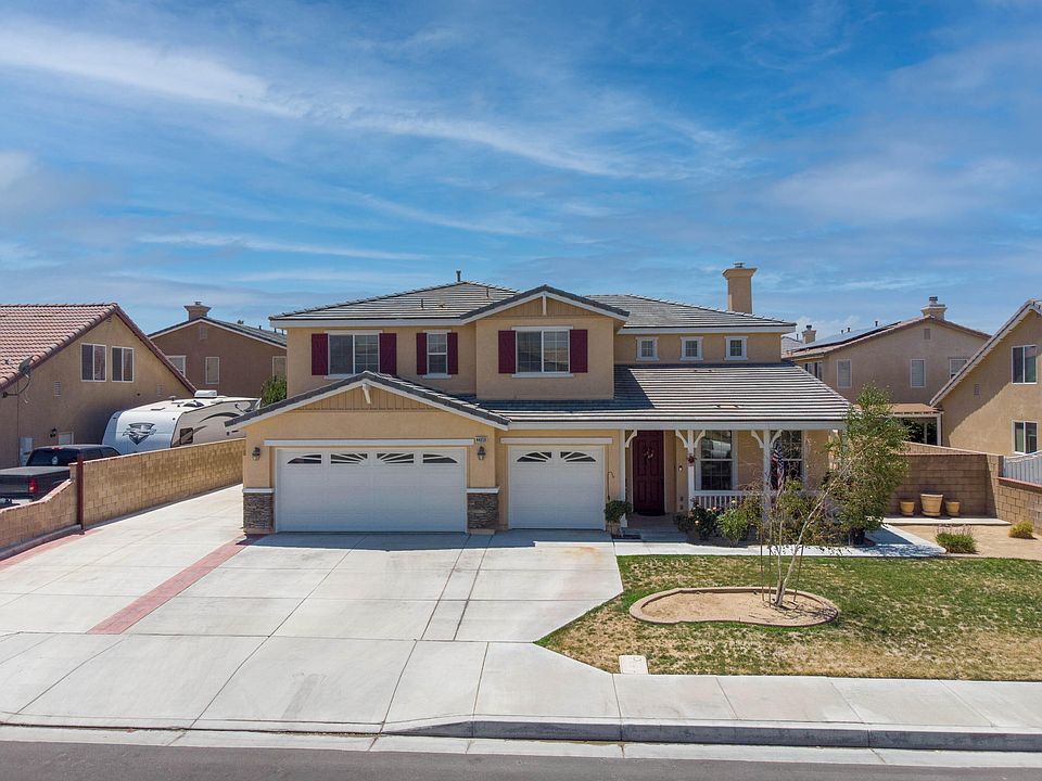 Beautiful 2 story home located in the west site, with lots of upgrades. 5 bedrooms, 3 full bathrooms. Elegant marble floor in the kitchen, walk in pantry, formal dining room, halls, spacious laundry room with sink included. Shutters in living room and formal dining area. Family room has a gas fireplace. A huge kitchen, electric oven, lots of cabinets, recessed ceiling lights, and tile counter tops. All bedrooms have ceiling fans. Master bathroom has a huge walk-in closet with mirror doors, garden tub, and dual sink. Interior intercom. Ceiling speakers. Carpet in all bedrooms. One bedroom is downstairs. Upstairs is a huge extra family room which can be converted in the 6th bedrooms. There is also a desk area. The patio is permitted with 2 ceiling fans and speakers. New Solar panels and special outside paint. The 4th car garage can be converted in the 7th bedroom. RV access. INCREDIBLE REDUCED PRICE, YOU MUST SEE IT!
