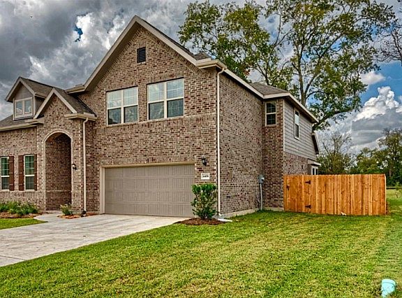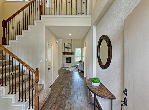 Backs to water & walking trails. Wrought iron fencing updated in 2022. Large island w/SS appliances + side-by-side fridge. Fireplace w/cedar mantle! Kitchen has quartz counters with pendant & under cabinet lights, large pantry. Wood flooring in the entry & family. Upgraded tile flooring, cabinet tub front in master bath. Granite in baths. High efficiency A/C. Modern fiberglass door. Brick porch & patio. Back patio extended with a modern, stamped cement design. Hot tub addition in the backyard (side). Sq Ft is approx.