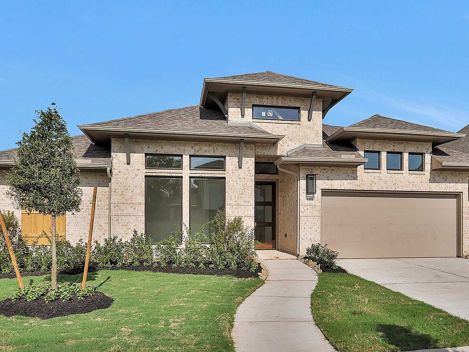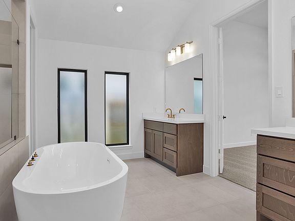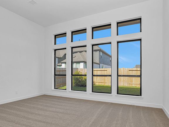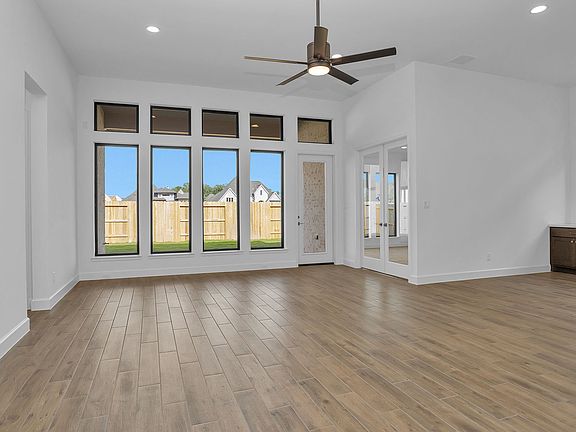 Home office with French doors frame entry. Open family room with a wall of windows extends to kitchen and dining area. Island kitchen with built-in seating space, 5-burner gas cooktop and a walk-in pantry. Game room with French doors just off the family room. Private primary suite with wall of windows. Primary bathroom features a French door entry, dual vanities, freestanding tub, separate glass enclosed shower and two walk-in closets. Guest suite with full bathroom and walk-in closet. Additional bedrooms with walk-in closets a half bathroom and Hollywood bathroom completes this design. Covered backyard patio. Utility room and mud room off the three-car garage. Representative Images. Features and specifications may vary by community.