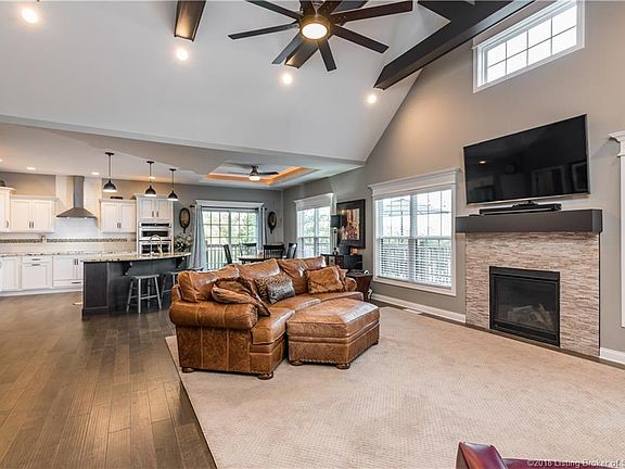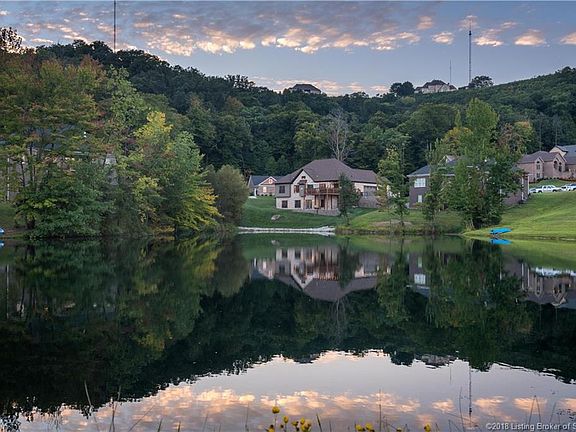 LAKEFRONT IN REFLECTION RIDGE...mere minutes to Louisville! Why settle for ordinary when you can have a Custom Finished Home in a location that features a Lake Front setting, Wooded Knob Views & Front Row seating to the Awe-inspiring Louisville Sky Line? If you are wanting a Modern Low Maintenance Retreat with an Exceptional Floor plan & Complimentary Upgrades, This Is Your Home! Upon approaching, you will notice the Extra Wide Driveway, 3 car Side-entry Garage, & Extraordinary Architectural Design enhanced by Flush Mount Lighting & Symmetrical Retaining Walls capped with Lamp Lanterns. It's easy to maintain this golf course look with the irrigation system already in place. Wander indoors to find so many extras like the Barrel Ceiling in the Foyer & the Robust, Exposed Wood Beams in the Great Room. Kitchen Enhancements include High Grade Quartz, Reverse Osmosis Water Filtration system, Built in Convention Microwave & Oven, Dove Tailed Soft Close Cabinetry & Pantry. This Split Bedroom Design affords tremendous Privacy & Unique ceiling characteristics in each room. The Master Suite is perfection with Lake Views, Double Sinks, Soaking Tub, Walk in closet & Tiled shower with Double Showerheads. Stroll downstairs & find a Finished Walk-out Basement featuring a Wet bar, Full bath, a Spacious 4th bedroom & a Versatile space easily accommodating a Pool table, Play areas & Family room. Be prepared to fall in love upon viewing!