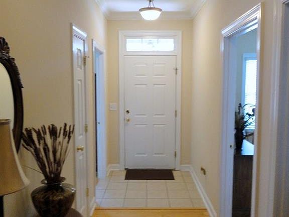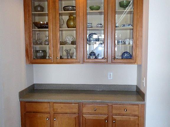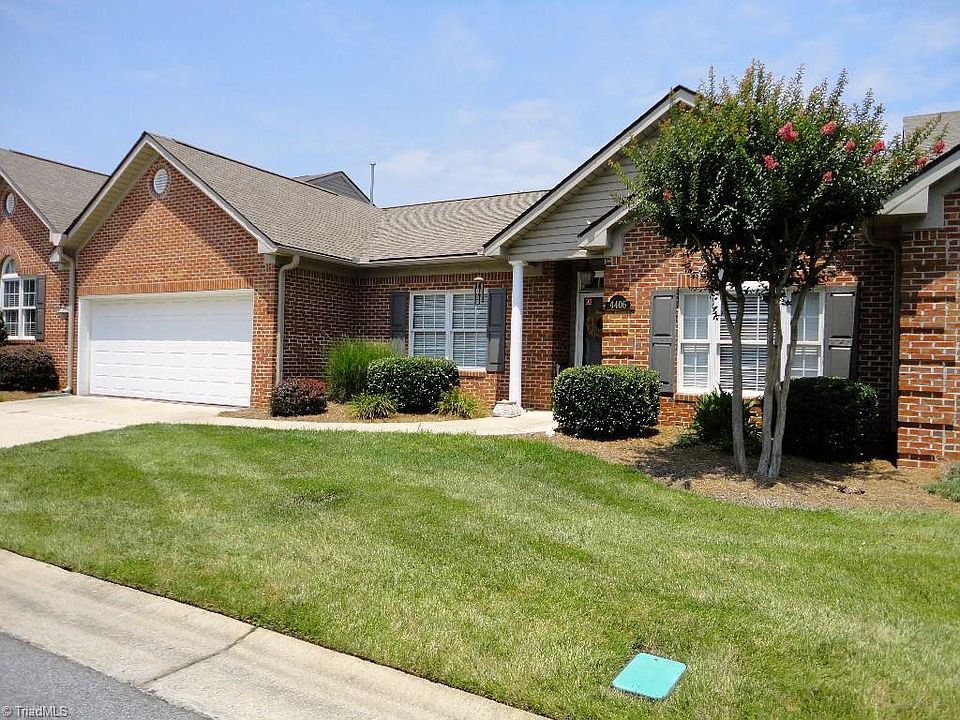 REMARKABLE HOME & IDEAL LOCATION combine to make this former model home & larger unit a GREAT VALUE! This one level home offers extensive hardwood flooring; solid surface counter tops; 42" wall cabinets; butler's pantry area; finished garage w/ stained/painted floor. Various ceiling heights include a cathedral ceiling in the sun room that leads to a private rear patio & a tray ceiling in the living room. The master suite also accesses rear patio & has separate shower / tub + back saver height dbl vanity.