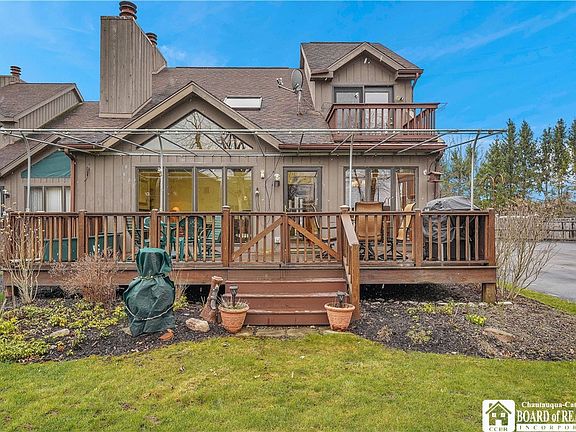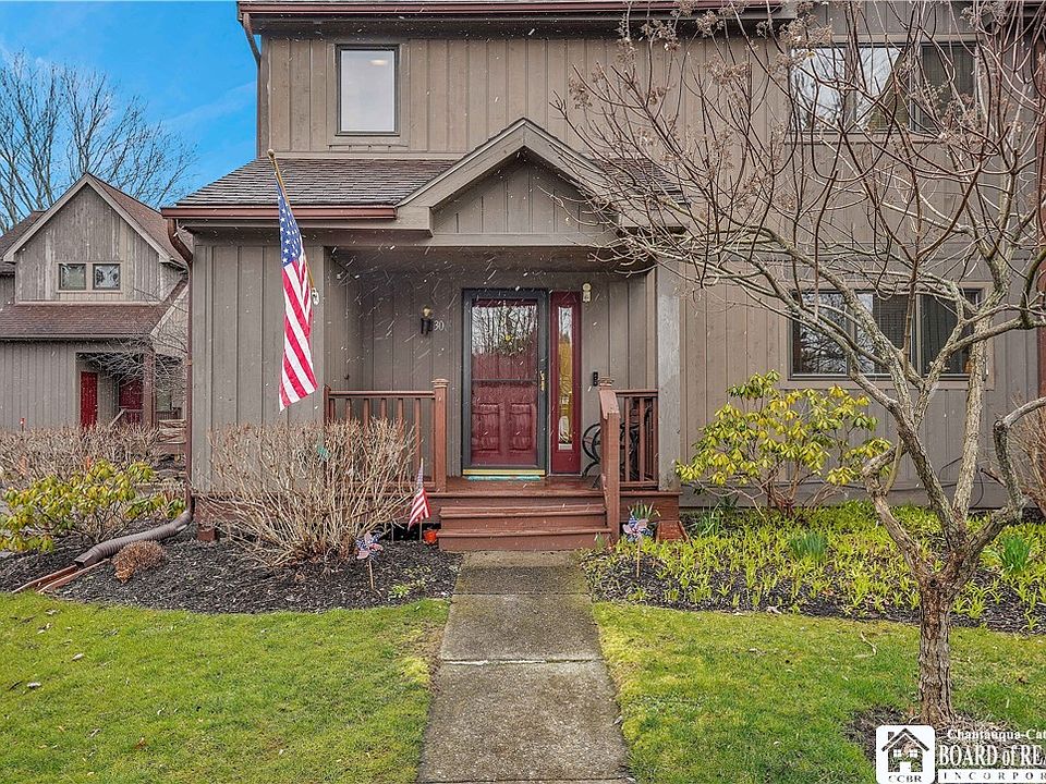 If you are looking to be part of a well-run condo association on Chautauqua Lake & want to begin making summertime memories in 2024, look no further! Enjoy this 3-bedroom, 3-bath year-round townhome all seasons. 1st floor bedroom is conveniently connected to full bathroom with special walk-in shower/tub. Kitchen is equipped with all appliances & has beautiful granite countertops. Floor-to-ceiling windows & skylight bring abundant daylight into this home. Gas fireplace has deep built-ins on either side allowing for lots of storage space. Laundry is located on 1st floor. Unit has on-demand water tank. The 2nd floor has 2 bedrooms with both having full en-suite bathrooms. The primary bedroom has a balcony with lake view. The 28'x10' back deck provides a lovely view of the lake & offers spacious green area to enjoy. The 9'x6' front porch has 6'x4' locked storage. The in-ground pool/pool house will add to your enjoyment during the summer months. Property includes a dock for your boating pleasures. Unit #30's assigned parking spot is directly outside your door. Bonus...WTP is just 1 mile from Chautauqua Institution. Delayed negotiations w/all offers due by 10 a.m. April 16th.