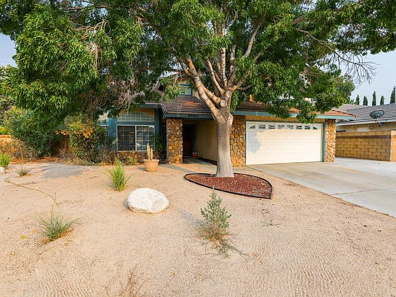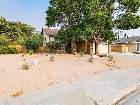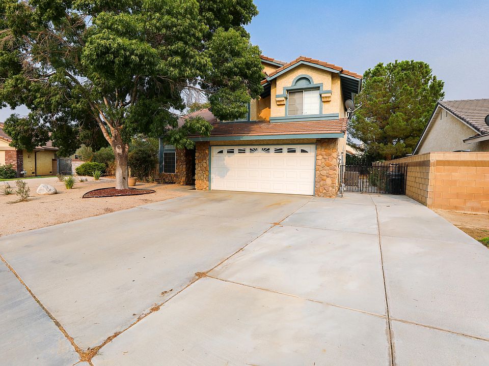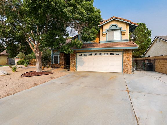 Beautiful two-level west Lancaster home with an attractive front appeal, wide driveway space and newly done desert landscape, with 2 car garage, and matured tree that sets off the look, tiled roof in excellent condition. Walk into a large clean spacious living room with raised ceiling and beautiful shinning wood floors with clean white walls giving off light throughout the entire house. Interesting half hexagon angled widows in living room and restroom's large step up bathtub add dimension to the rooms. Good working kitchen has room and u-shape granite top workspace counters with matching granite style tile, lots of surrounding wood cabinets. Master bedroom very spacious, raised ceiling and buff clean wood floors entire downstairs and upstairs. This house projects positive open space and light and flows well throughout the home. Enjoy the luxury of owning this well maintained and spacious house and huge backyard with covered patio, perfect for whole family entertainment.