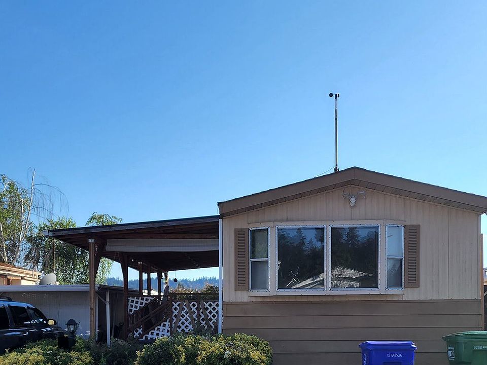 Located in Parkland Mobile Terrace! This home is a 55+ community. Space rent is $450 month and includes water, sewer, garbage, yard debris and recycling plus free use of the clubhouse! There is a non-refundable $50 application fee per applicant to park. This single wide home is a fixer but features 2 bedrooms, 1.5 baths, covered deck, carport, plenty of storage, full size washer & dryer, forced air heating and A/C! Close to shopping, restaurants, bus line, and freeways! Come see today!
