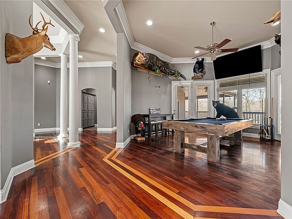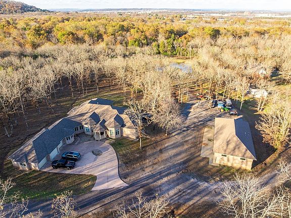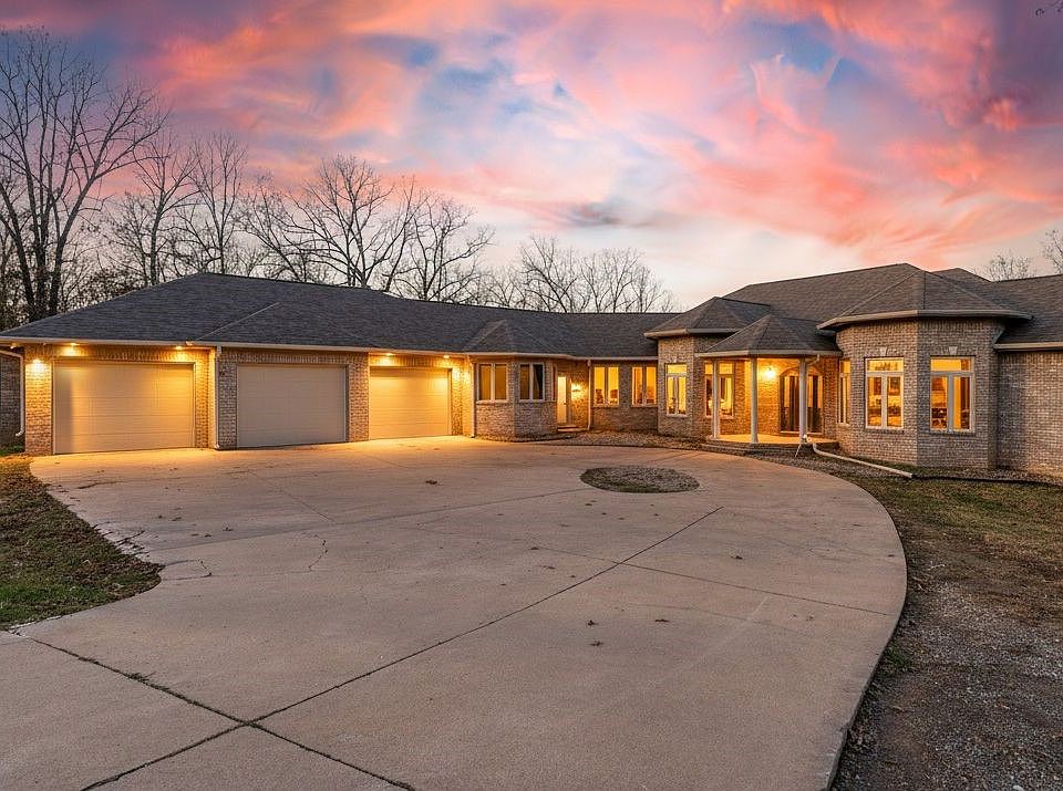 Welcome to this exceptional 5,616 sq/ft custom estate. The main level offers 4,989 sq/ft of light-filled living space, featuring custom hardwood floors and oversized triple-pane windows that enhance natural light, energy efficiency, and year-round comfort. The chef’s kitchen with stainless steel appliances is perfect for everyday cooking and entertaining. The private master wing includes direct access to a 1,200 sq/ft covered back porch and boasts two walk-in closets, plus a spacious bathroom with dual vanities, dual shower, and jetted tub. Two additional bedrooms on the main floor, each with a private bath and walk-in closet, offer privacy for family or guests. A large office, foyer, dining room, and living room seamlessly flow in this thoughtfully designed floorplan. The fully finished walk-out basement serves as an in-law apartment, complete with laundry and kitchen. The park-like 6.89± acres with a pond and separate driveway also has a 32×64 shop, complete with a heated and cooled bathroom and a car lift.