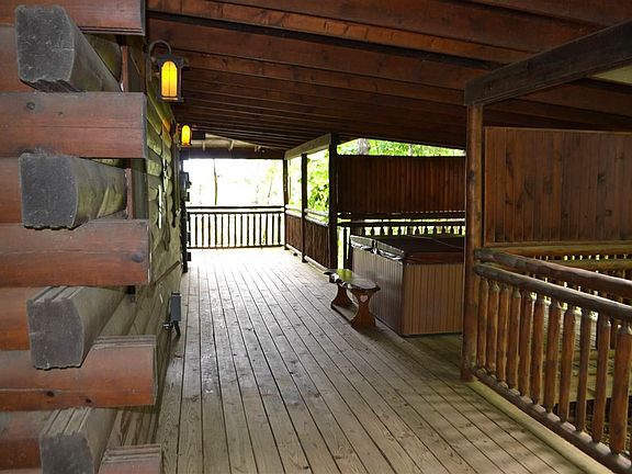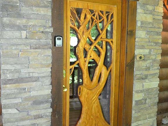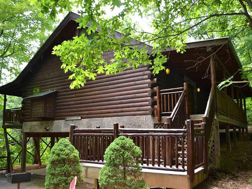 Located in the Arts & Crafts Community of Gatlinburg, this well appointed, romantic, Honeymoon Studio log cabin for two captures the imagination with all its artistic touches. From the hand carved wood front door to the stacked stone fireplace with the locally carved custom mantel you will discover that local artisans played a big part in the creation of this log cabin. A massive man-made tree runs throughout the cabin. The kitchen was done from a local 100 year old barn. It is fully equipped and offers seating for four at the counter bar. The entire far wall is a glass etched scene of the Smoky Mountains. The living area is complete with a large leather sofa set in front of a 42 inch flat screen TV and a gas fireplace. Under the canopy of the tree there is a king bed accented with lanterns and a romantic barrel accented jetted tub for two. The enclosed bathroom has a double headed shower also made from local river rock. The wrap-around covered deck had all the log rails made from a local company and holds the hot tub, porch swing and rocking chairs. Back road access to get you to Dollywood, Pigeon Forge and Downtown Gatlinburg!